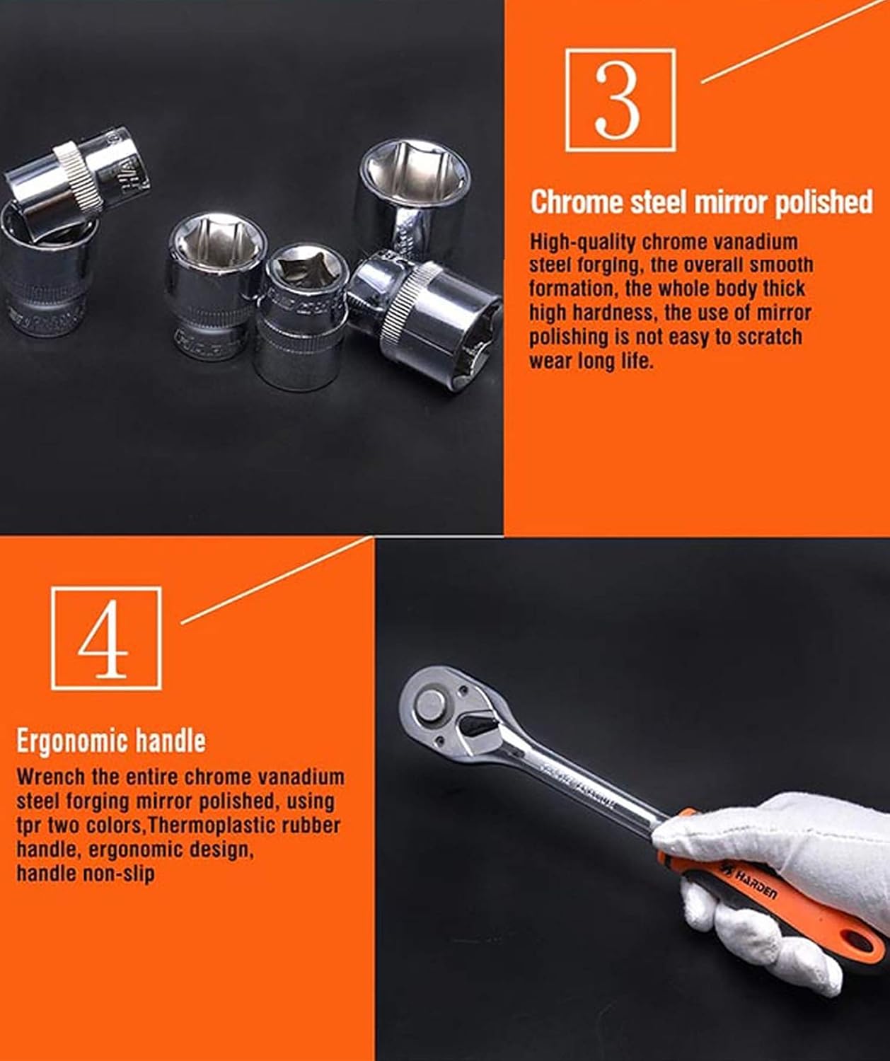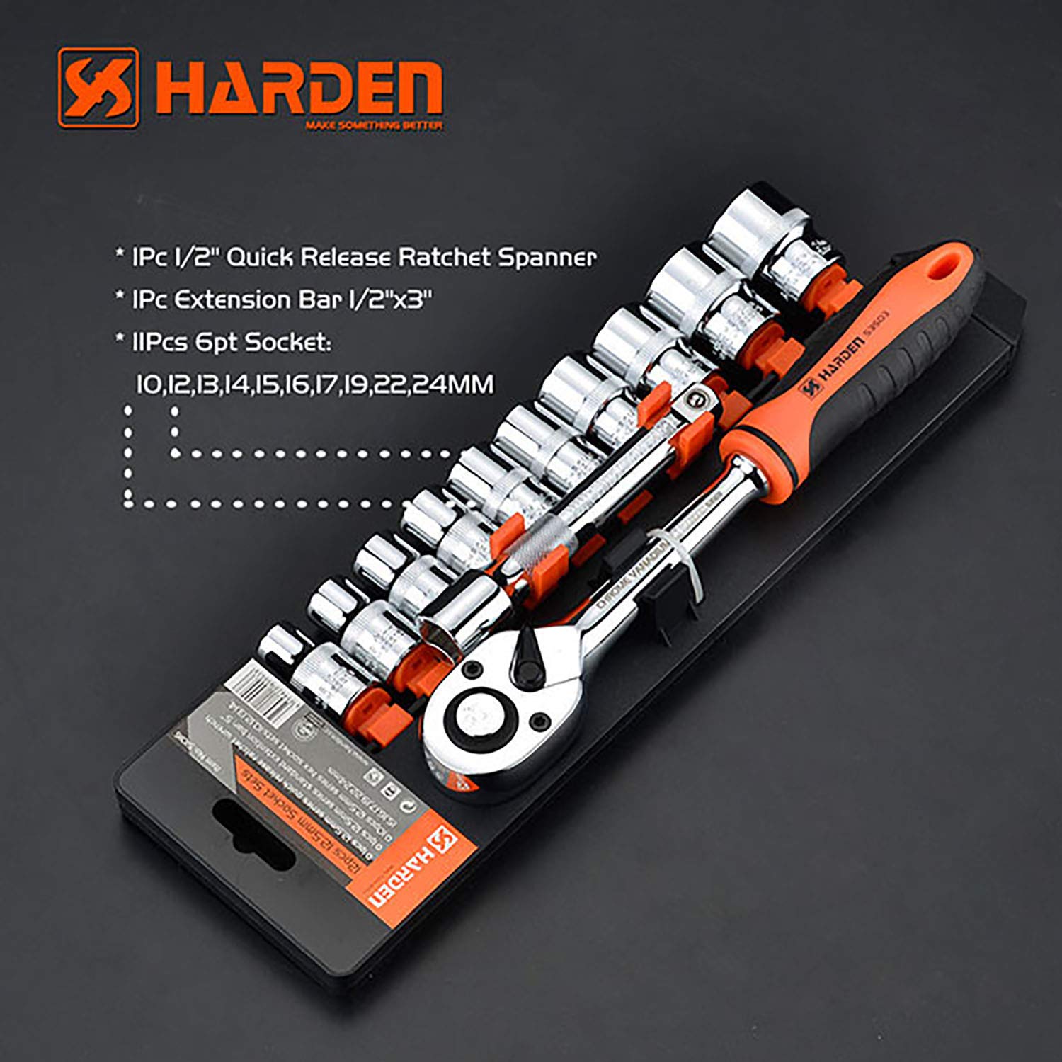 Este set profesional de 12 piezas de la marca Harden (modelo 510016) está diseñado para uso intensivo en talleres, ferreterías y mantenimiento técnico. Fabricado en acero cromo-vanadio de alta dureza con acabado cromado espejo, cada pieza ofrece gran torque, durabilidad y resistencia a la corrosión. Incluye mango de carraca de liberación rápida ½″ (12,5 mm), barra de extensión estándar y diez vasos métricos clave (10, 12, 13, 14, 15, 16, 17, 19, 22, 24 mm). Su mecanismo de 72 dientes permite cambiar de dirección con sólo 5 grados de giro, lo que mejora la eficiencia en espacios reducidos. El agarre ergonómico anti-resbalante y la cabeza de accionamiento auto-bloqueante garantizan seguridad y facilidad de uso. Ideal para abastecer la sección de herramientas en ferreterías mayoristas o para dotar a un taller profesional.